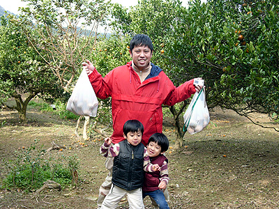 ■家族で、本部町の伊豆味にみかん狩りに行きました。春陽はひたすらみかんを採り続けていましたが、秋晴はすぐに飽きて、みかん畑の石をひっくり返したりして遊んでいました。何が面白かったんだろう?でも7キロほど収穫(?)して、お土産に持ち帰りました。